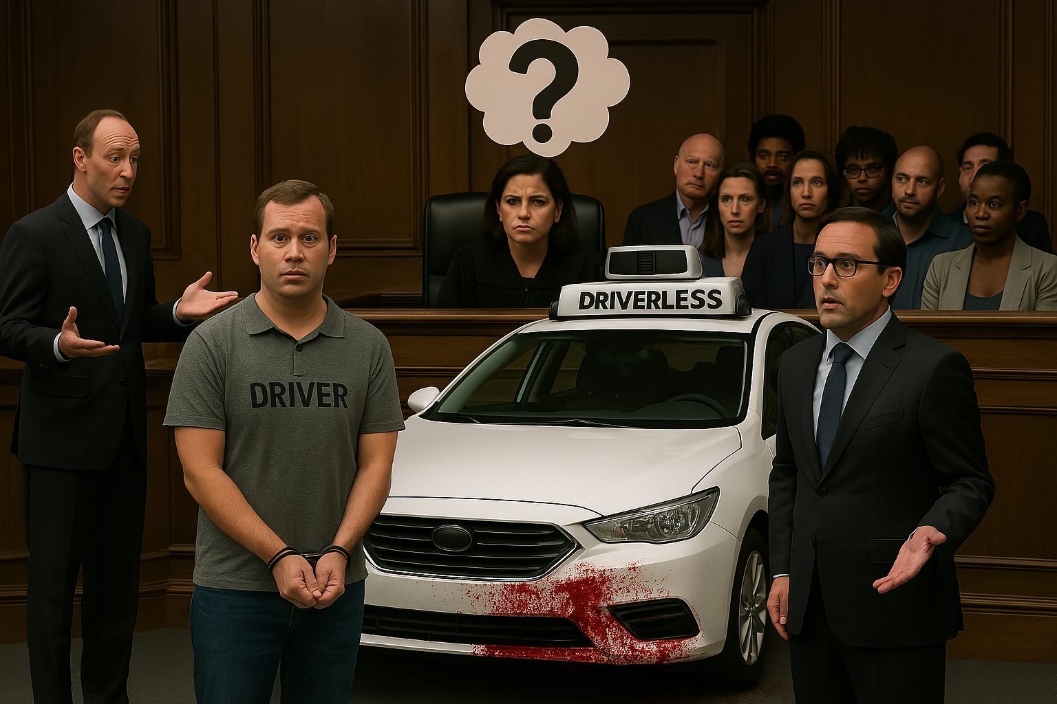 A symbolic depiction of the ethical and legal accountability surrounding autonomous vehicles after a fatal incident.
