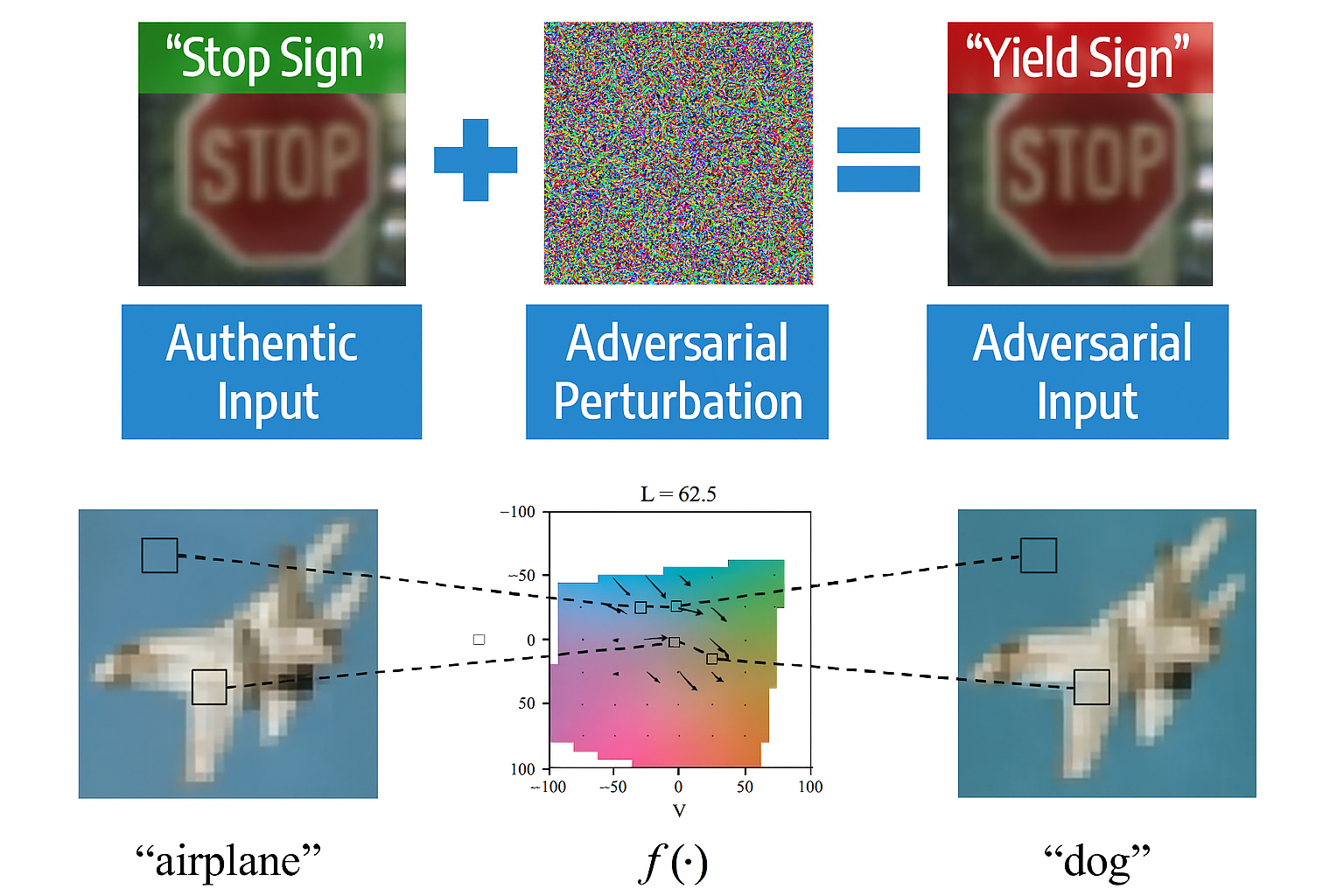 This figure shows how adversarial perturbations cause machine learning models to misclassify images. A stop sign is misclassified as a yield sign, and an airplane image is misclassified as a dog. The examples illustrate the vulnerability of vision models to small, targeted input changes. Source: dx.doi.org/10.36959/643/306.
